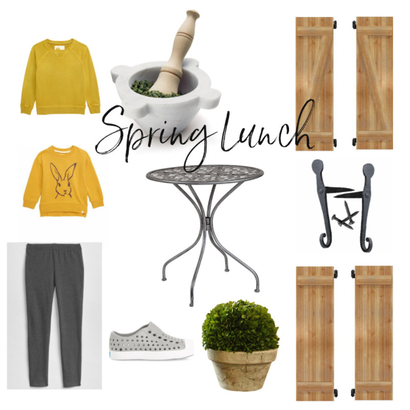 Here’s a little shoppable collage I put together with links to some specific products shown above (our mortar & pestle and Gisele’s outfit) along with similar products like shutters similar to our shutters & shutter dogs-which are original to the house (I finally found them!!) and our old french bistro table. ***Update Gisele’s bunny sweatshirt is sold out-apologies! Click on the product photos for sources or to shop.