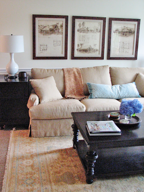 Our client found the old cabin blueprints above the sofa at a thrift store years ago and we loved them too so we had them framed. The blue bowl on the coffee table is one I found a while back and its design is made out of safety pin idents into the clay that were then outlined in gold. Right now it’s a corral for the remote controls, but when entertaining it can be emptied and filled with something pretty like flowers or napkins or something seasonal.