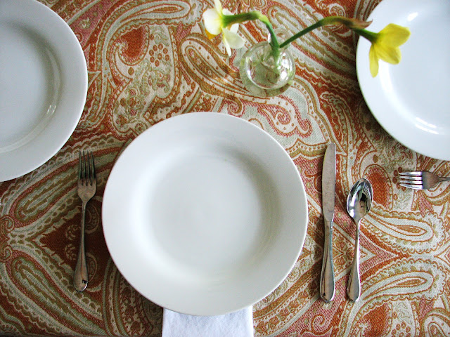 {I used a massive piece of peachy-pink & aqua woven paisley fabric that I bought a while back as the table cloth. It usually hangs out in our family room as a throw blanket.}